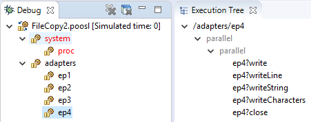 When debugging a POOSL model, the adapter instances are visible in the Debug View and in the Sequence Diagram. Moreover they can be inspected in the Execution Tree View after selecting one: