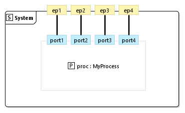The following example POOSL model has 4 external system ports: