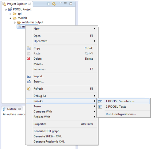 - Right click in an open editor, or on a .poosl file in the Project Explorer. Select "Run As" -> "POOSL Simulation".