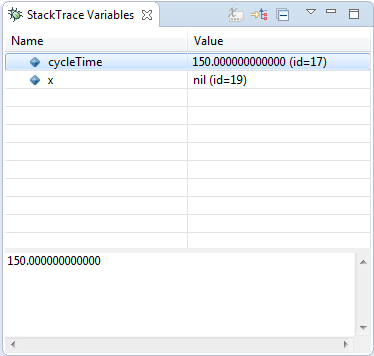 The StackTrace Variables view is normally part of the StackTrace window, which is shown if an error occurs while debugging a model. It shows all parameters and variables that are accessible by the selected stackframe in the StackTrace view. The displayed values are computed using the corresponding data method printString. When selecting a variable in the Stack Variables view, the value is expanded recursively with its internal variables.