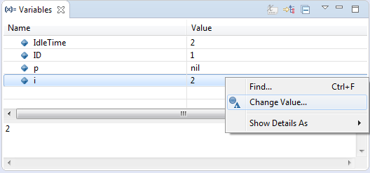 The value of a variable can be changed during debugging. To change the value, right click the variable and select "Change Value..."; in the opened window you can enter a new POOSL value. Alternatively, click on the value in the second column, and directly enter a new POOSL value. The integer ID for non-primitive classes should not be part of a new POOSL value.