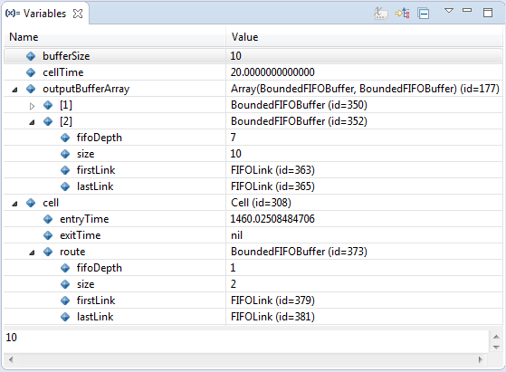 The displayed string representation of each value is computed using the printString method from the data class of the value. If this data class is a non-primitive class, then an integer ID is appended. The IDs provide an object-oriented view that can be used to determine which variables refer to the same object. Variables will not be shown when an external adapter instance is selected in the debug view (see Co-simulation for more info).